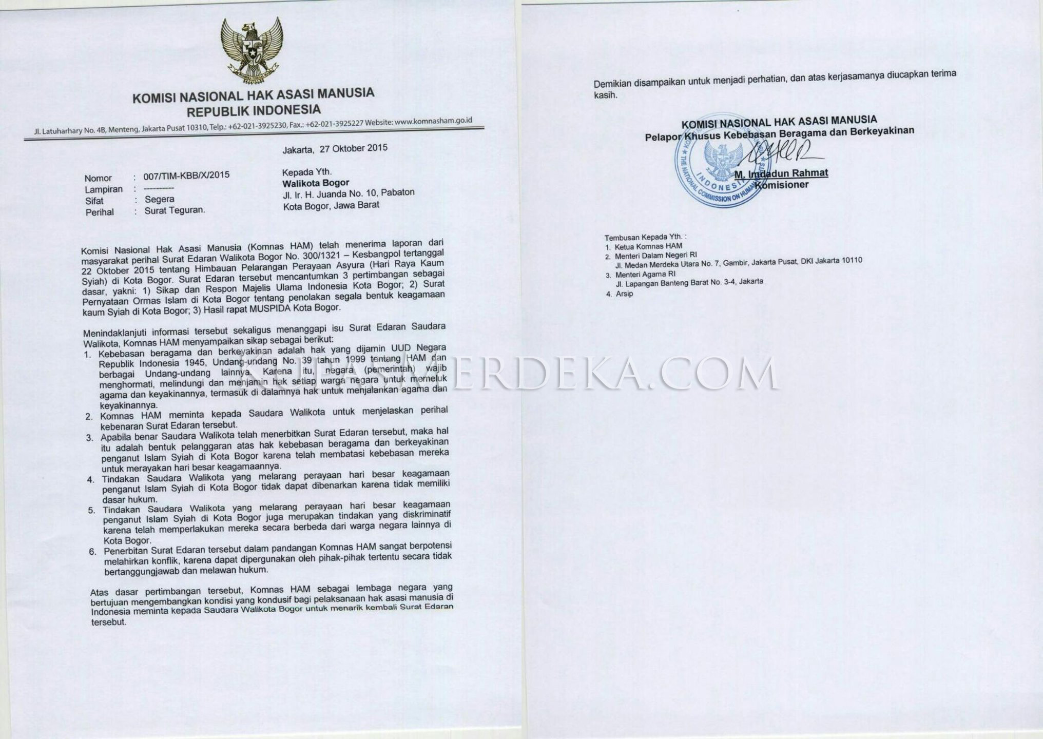 Surat Teguran Komnas HAM kepada Bima Arya 27 Oct 2015