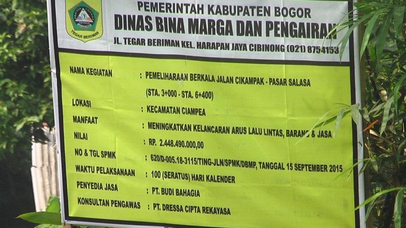 plang proyek jalan cicadas cikampak Plang proyek pengaspalan jalan di Cicadas yang menunjukkan biaya proyek tersebut. (DOK. km) KupasMerdeka.com Berita Bogor