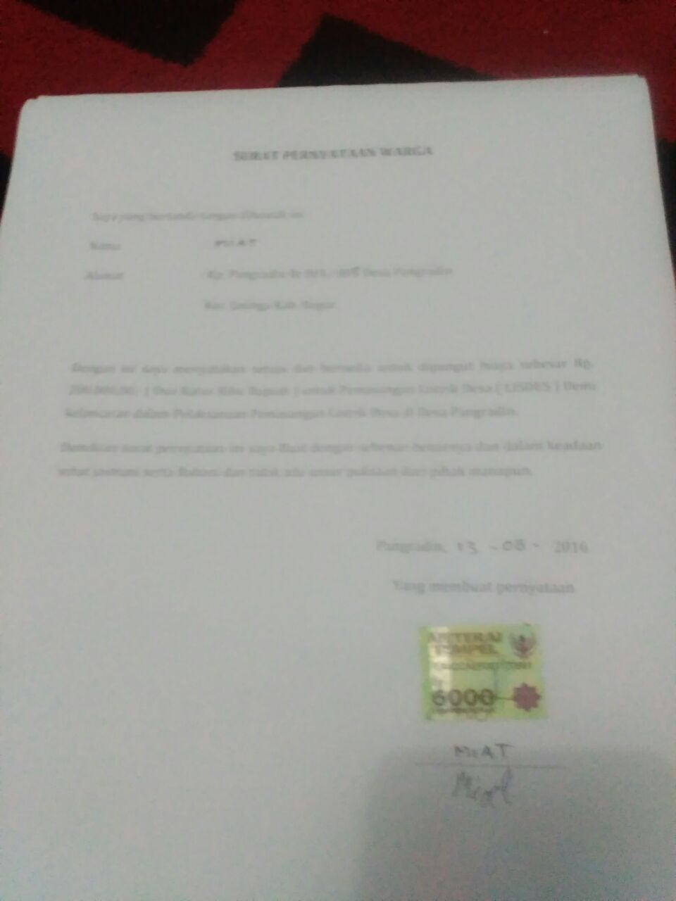 surat pernyataan yang di dramatisir oleh oknum perangkat desa pangradin untuk menutupi kegiatan pungli