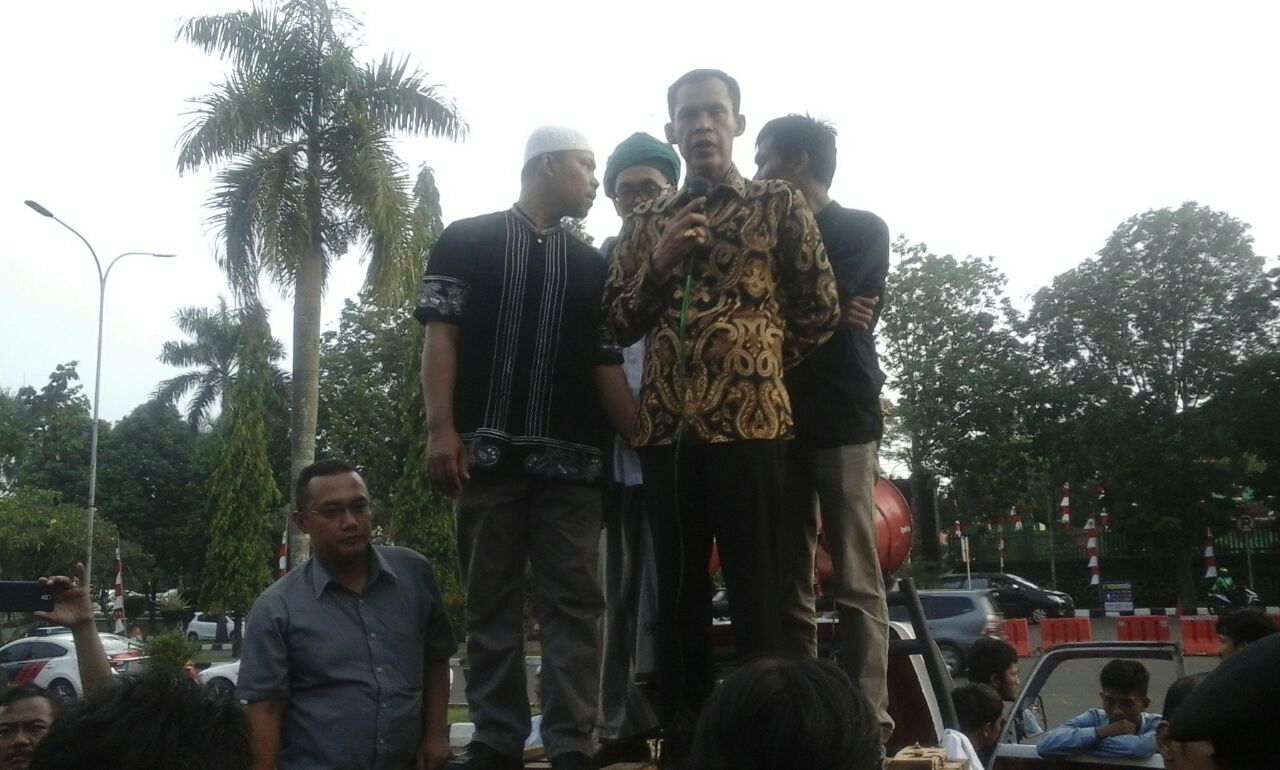 jaro ade Ketua DPRD Kabupaten Bogor Ade Ruhandi memberikan tanggapannya kepada massa pendemo dari Aliansi Masyarakat penyelamat Bogor (AMPB), Kamis 8/9 Lalu (dok. Dian/KM) KupasMerdeka.com Berita Bogor