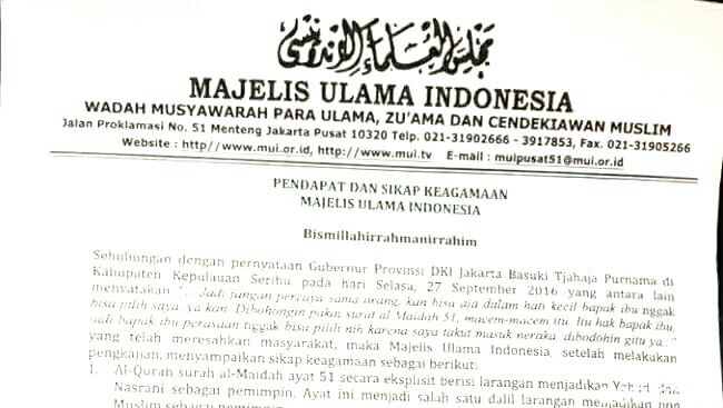 surat-mui Surat pernyataan MUI tentang perkataan Gubernur DKI Jakarta Basuki Tjahaja Purnama yang menyinggung soal Al Qur'an surat Al Maidah Ayat 51 (dok. KM) KupasMerdeka.com Berita Nasional