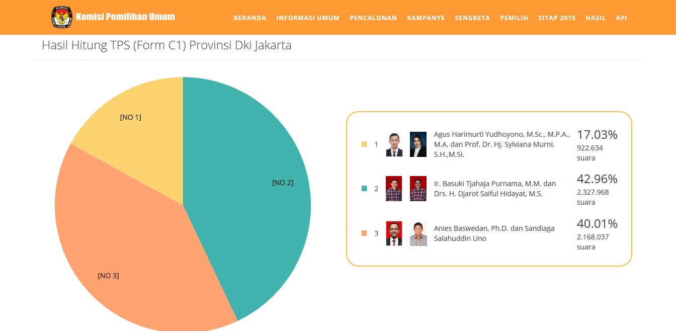 pilgub dki 2017 Hasil penghitungan suara resmi KPU di Pilgub DKI Jakarta 2017, dari laman resmi KPU.go.id per Jumat 17/2 (dok. KM) KupasMerdeka.com Berita Jakarta
