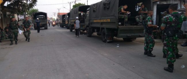 TANGERANG (KM) – Aparat gabungan TNI dan POLRI yang dibantu berbagai ormas tampak berjaga-jaga di sepanjang jalan yang yang memisahkan Kecamatan Mauk dengan Kecamatan Sukadiri guna mengantisipasi terjadinya bentrokan antar warga.