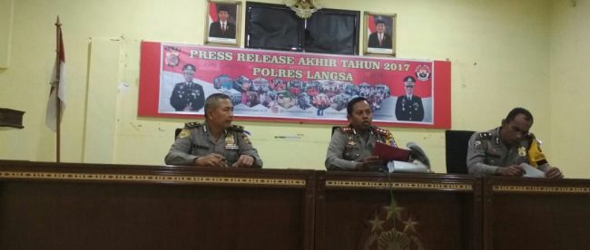 Kalpolres Langsa AKBP Satya Yudha Prakasa yang didampingi oleh Kabag Ops Kompol Chairul Ikhsan dan Kabag Sumda Kompol Kasnap, menjelaskan saat jumpa pers kepada para awak media hingga 29 Desember 2017, jumlah gangguan Kamtibmas di Kota Langsa sebanyak 771 kasus dengan penyelesaian sebanyak 465 kasus atau 60,31 persen. Jumlah ini menurun bila dibandingkan tahun 2016 yang mencapai 930 kasus dengan penyelesaian 640 kasus atau 68,8 persen.