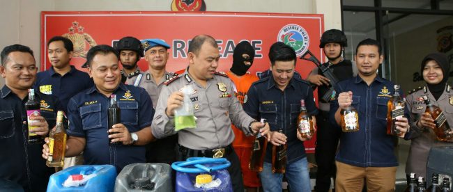 “Adapun tersangka berinisial SM (31), serta barang bukti yaitu 99 botol miras oplosan siap edar, dikemas menggunakan botol bekas jenis Black Label, 119 botol miras oplosan siap edar yang dikemas menggunakan botol bekas merk Chivas Regal,1 botol miras oplosan yang dikemas siap edar menggunakan botol bekas jenis Absolut Vodka, 149 botol kosong berbagai merk, 42 dus bekas kemasan botol miras berbagai merk, 1 buah jerigen bekas kemasan alkohol metanol 96%, 1 buah galon air mineral ukuran 600 ml, 1 botol soft drink Coca Cola, 1 buah botol suplemen ginseng Sting cairan berwarna kuning, 1 buah botol You C1000, 1 buah botol minuman Jamaica Rum, 1 buah teko plastik, 2 buah corong plastik yang telah dimodifikasi berbentuk saringan dan corong air, 2 buah semprotan obat nyamuk baygon unt menyemprot tutup botol, 1 buah alat pemanas plastik berbentuk hairdryer warna kuning, 1 lembar stiker botol Chivas ilegal nenee diduga palsu dan 1 lembar label stiker cukai diduga palsu,” papar Kapolres.