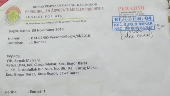 peradmi somasi Surat Somasi 1 kepada Ketua LPM Curug Mekar, Kecamatan Bogor Barat, Kota Bogor (dok. KM) KupasMerdeka.com Berita Bogor