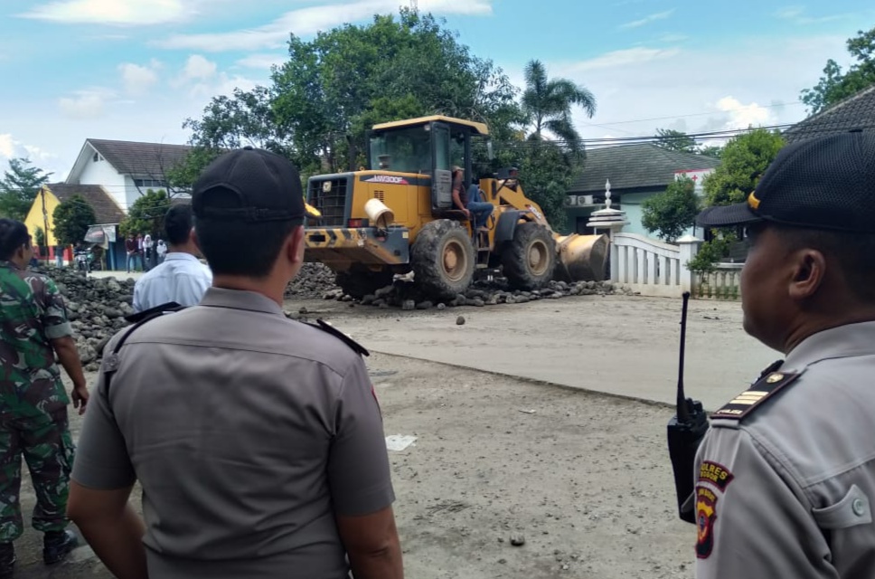 meratakan0201 Polisi memantau proses pembersihan bebatuan yang sengaja diturunkan di tengah jalan dekat kantor Kecamatan Gunung Sindur, Rabu 2/1/2019 (dok. KM) KupasMerdeka.com Berita Bogor