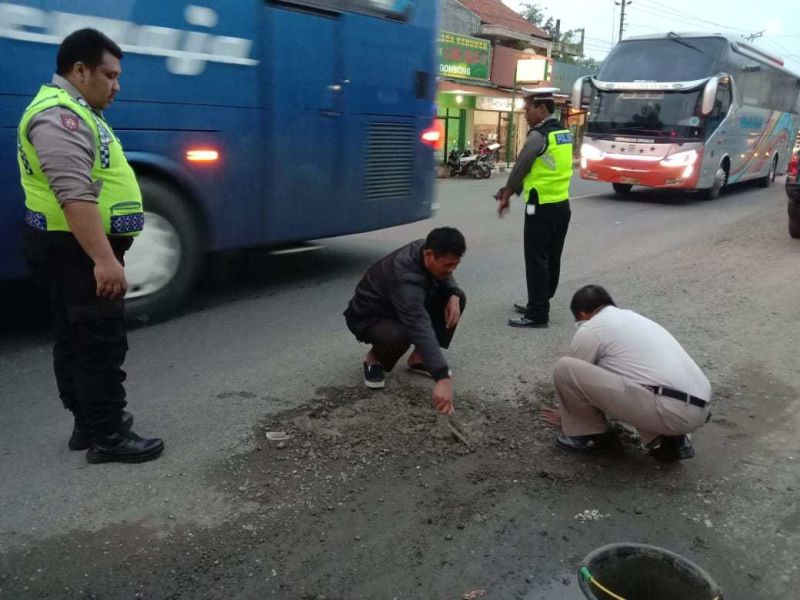kecelakaan-kebumen Polisi menutupi lubang di Jalan Yos Sudarso, Gombong, Kebumen, dengan adukan semen (dok. KM) KupasMerdeka.com Berita Kebumen