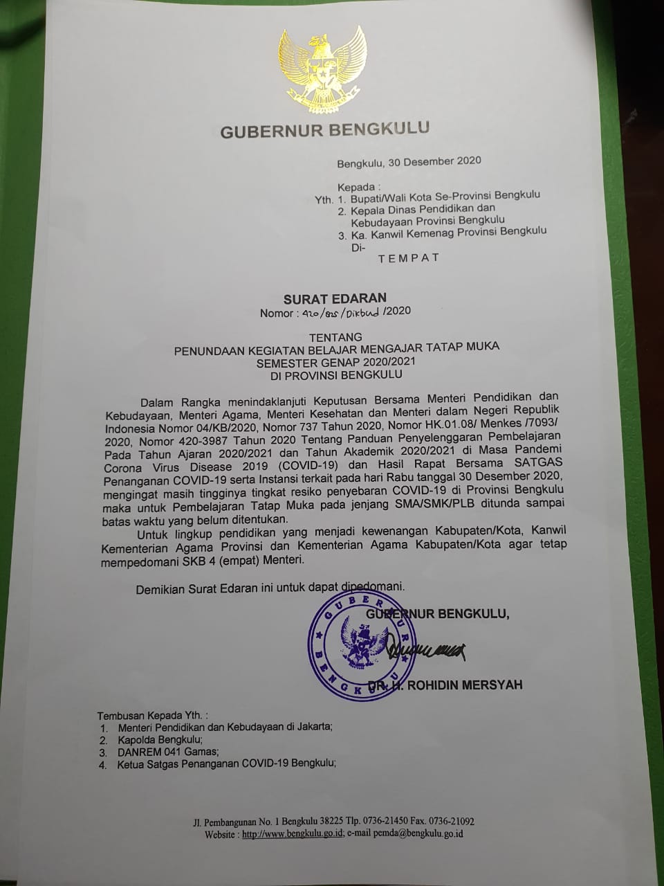 Surat Edaran Gubernur Bengkulu