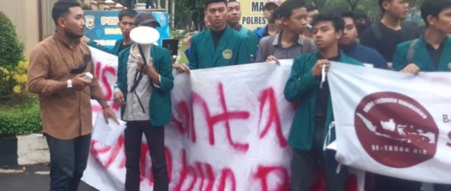 BOGOR (KM) – Badan Eksekutif Mahasiswa (BEM) Se-Tanah Air melakukan demonstrasi untuk mendesak Polres Bogor menuntaskan kasus penimbunan BBM bersubsidi di Jalan Raya Kranggan, Kecamatan Gunung Putri. Aksi itu berlangsung di depan Mapolres Bogor, Jalan Tegar Beriman, Kabupaten Bogor, Jumat (16/12).
