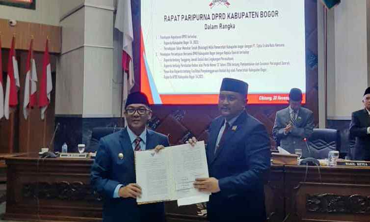 42d13f047-ead8-44a1-a6de-e49552b0617b Plt. Bupati Kabupaten Bogor Iwan Setiawan bersama Ketua DPRD (Dewan Perwakilan Rakyat Daerah) Kabupaten Bogor menyetujui PP Perda 2023, di Gedung DPRD Kabupaten Bogor, Rabu (30/11/2022) (Doc : Hari Setiawan Muhammad Yasin/KM)
