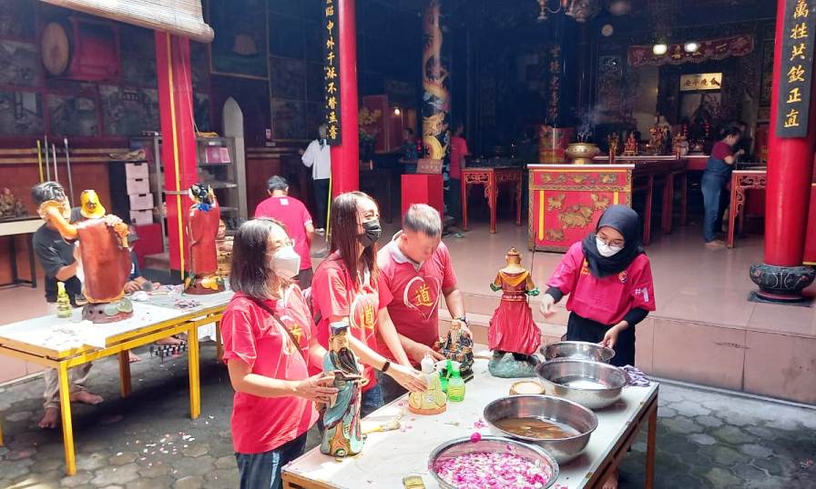 Beberapa relawan tampak sedang membersihkan patung untuk persembayangan upacara perayaan Imlek, Senin (16/1/2023)