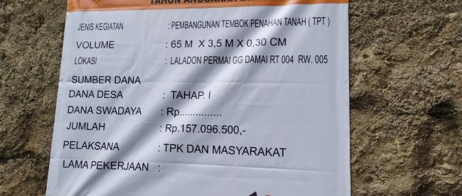Dilihat dari papan informasi proyek di lokasi, bahwa pekerjaan pembangunan TPT bagian dari rekonstruksi peningkatan kapasitas struktur tebing dengan pagu anggaran Rp157.096.500,- dengan sumber dari Dana Desa tahap 1 tahun 2023 yang dikerjakan oleh Tim Pelaksana Kegiatan (TPK) dan masyarakat.