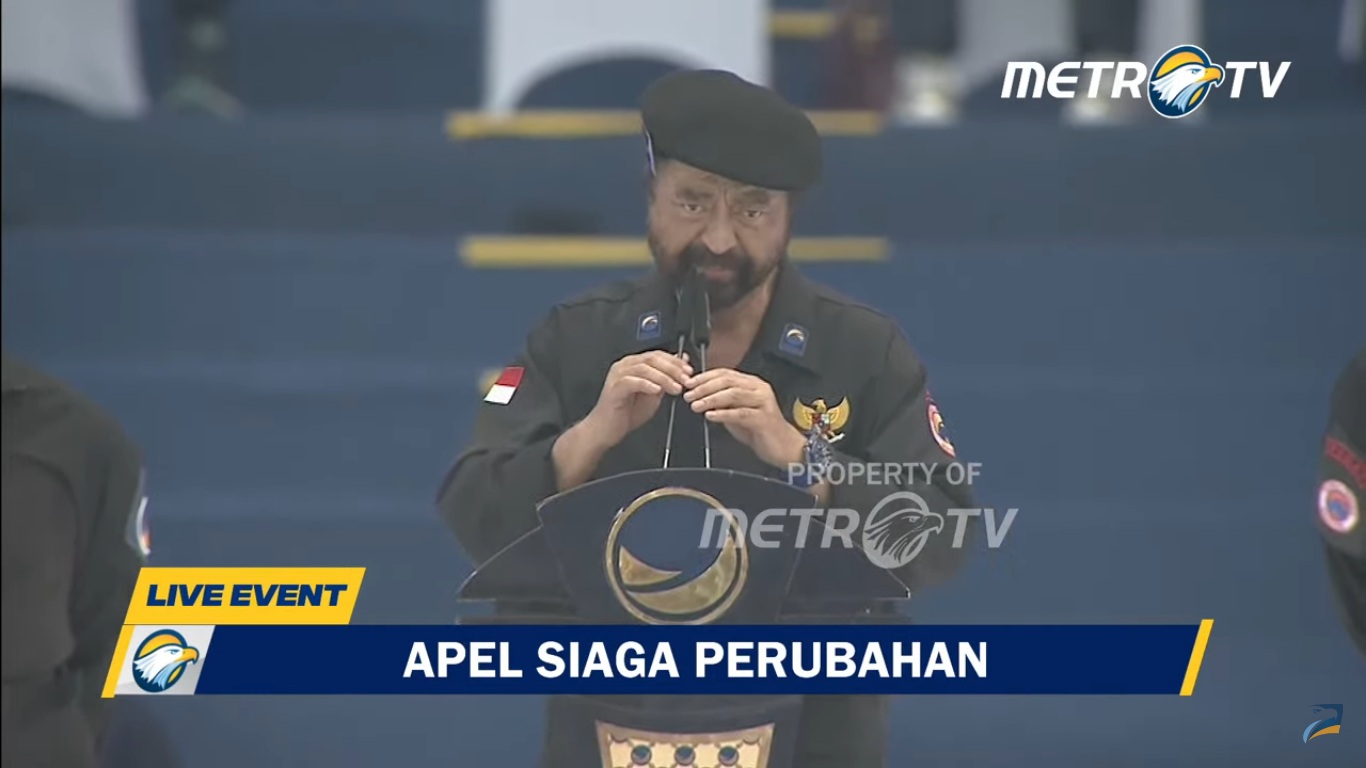 apel perubahan 0mvaa Surya Paloh, Ketua Umum Nasdem dalam Apel Siaga Perubahan di Jakarta, Minggu (16/7/2023) (Foto: screenshot Live MetroTV)