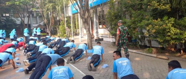 Sidoarjo (KM) – Dalam rangka untuk meningkatkan kemampuan siswa dan menanamkan disiplin dan bersikap sejak dini Peltu Ach Chuzaini melaksanakan giat PBB kepada siswa/siswi SMK Senopati, Selasa (25/7).