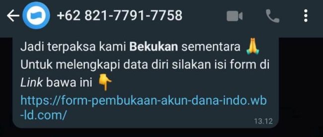 Dalam hal ini, modus pelaku dengan nomor 0821-7791-7756. Sekitar pukul 14.00 wib, awalnya mengirim sebuah pesan yang mengaku bernama Wisnu dari salah satu platform, bahwa akun korban dibekukan sementara waktu, sehingga tidak dapat bertransaksi.
