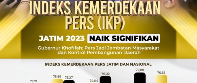 SURABAYA (KM) – Indeks Kemerdekaan Pers (IKP) Jawa Timur naik signifikan di tahun 2023. Berdasarkan hasil survei IKP Indonesia yang diselenggarakan Dewan Pers tahun 2023, IKP Jatim ada di angka 76,55.