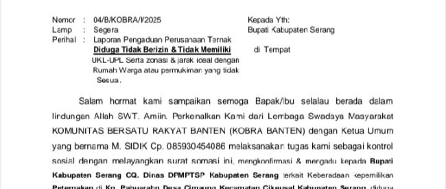 Menyikapi hal tersebut, M. Sidik, S.Pd. selaku Ketua umum Komunitas Bersatu Rakyat Banten (KOBRA-BANTEN) menyatakan pihaknya sudah melakukan investigasi ke masyarakat dan sudah bisa menyimpulkan bahwa perusahaan ternak ayam petelur tersebut sudah melanggar peraturan daerah Kabupaten Serang.