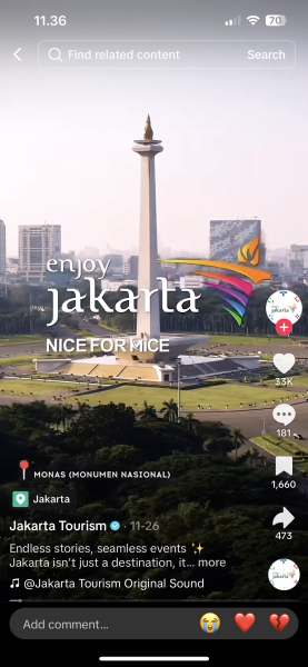 Video-video singkat ini menampilkan berbagai daya tarik Jakarta, mulai dari kuliner legendaris, festival budaya, hingga pengalaman unik di pusat kota. Dipadukan dengan menggandeng para International Key Opinion Leader (KOL), nama Jakarta yang di branding kan sebagai kota Nice for MICE menjadi semakin mendunia di kacamata pengguna media sosial di berbagai negara seperti Tiongkok, Malaysia, dan Singapura.