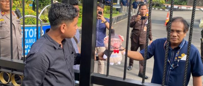 Sebagai simbol protes, massa aksi menyerahkan boneka babi kepada perwakilan Kementerian Keuangan, yang diterima oleh Humas Kemenkeu, Pak Nano.