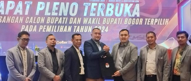 BOGOR (KM) – Komisi Pemilihan Umum (KPU) Kabupaten Bogor resmi menetapkan pasangan Rudy Susmanto – Ade Ruhandi sebagai Bupati dan Wakil Bupati Bogor periode 2024 – 2029 dalam Rapat Pleno Terbuka yang digelar di Hotel Haris, Cibinong City Mall, Rabu (5/2/2025).