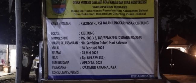 BEKASI (KM) – Proyek infrastruktur jalan (Betonisasi) yang berjudul, Rekonstruksi Jalan Lingkar Pasar Cibitung Nomor SPMK: PG.000.3.3/187/SPMK/PJL-SDABMBK/2025, yang dikerjakan oleh CV. Timur Sarana Jaya dengan total anggaran Rp.649.329.137 dari APBD 2025 Kabupaten Bekasi, sudah mengalami patah dan kerusakan di beberapa titik, diduga dikerjakan tidak maksimal.