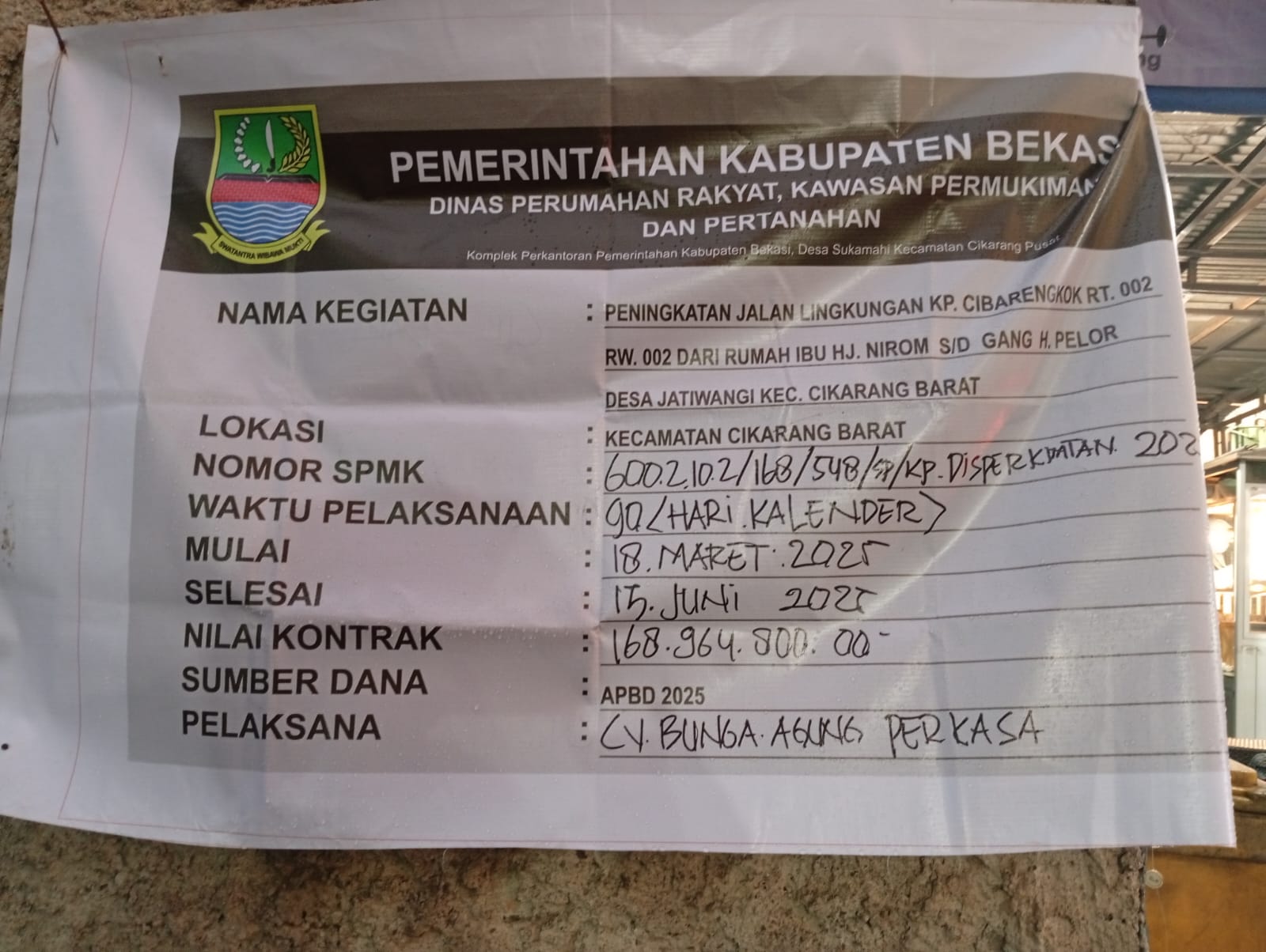 Peningkatan Jalan Lingkungan Kp Cibarenggkok Rt.002/002, Desa Jatiwangi, Kecamatan Cikarang Barat