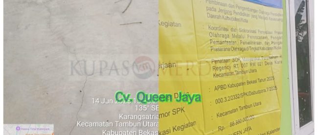 Terpisah, Wika pengawas dari Dinas Dispora Kabupaten Bekasi, saat dikonfirmasi mengenai dua kegiatan yang sudah mengalami keretakan, ia menanggapi. Terima kasih atas informasinya, saya sudah konfirmasi ke pelaksananya agar segera diperbaiki dengan cara di inject memakai sika.