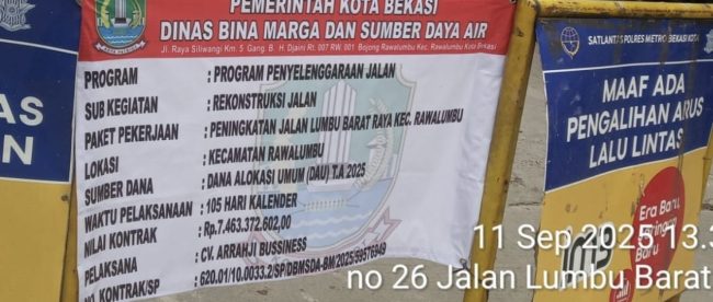 Kota Bekasi (KM) – Pekerjaan Rekonstruksi Jalan, Peningkatan Jalan Lumbu Barat Raya, Kecamatan Rawalumbu Kota Bekasi, Sumber Dana Alokasi Umum (DAU) Tahun 2025, diselenggarakan Dinas Bina Marga Dan Sumber Daya Air ( DBMSDA) Kota Bekasi, yang dimenangkan CV. Arrahji Bussiness, dengan Nilai Kontrak RP. 7,4 milyar,