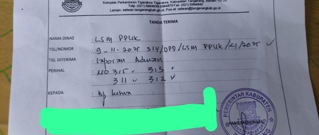 Berdasarkan tanda terima laporan yang dikeluarkan Sekretariat DPRD Kabupaten Tangerang, surat dengan nomor 311/DPD/LSM PPUK/XI/2025,312/DPD/LSM PPUK/XI/2025,313/DPD/LSM PPUK/XI/2025, 314/DPD/LSM PPUK/XI/2025, 315/DPD/LSM PPUK/XI/2025 tersebut telah diterima dan dicatat oleh bagian umum DPRD pada tanggal 9 November 2025.