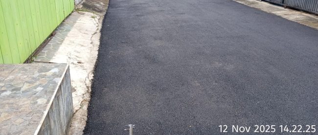 Untuk pekerjaan tersebut ada dua item, yaitu, betonisasi dan aspal, namun. Untuk ketebalan betonisasi saat di ukur dengan alat ukur (meteran) terdapat 8 cm, sedangkan standar spesifikasi ketebalan betonisasi jalang jalan lingkungan 10 cm.