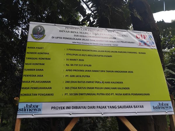 Keterangan Foto: Papan nama proyek rekonstruksi ruas Jalan Parungpanjang – Bunar diduga menggunakan BBM solar subsidi, Senin (27/04/2028) (Dok : Hari Setiawan Muhammad Yasin/KM)