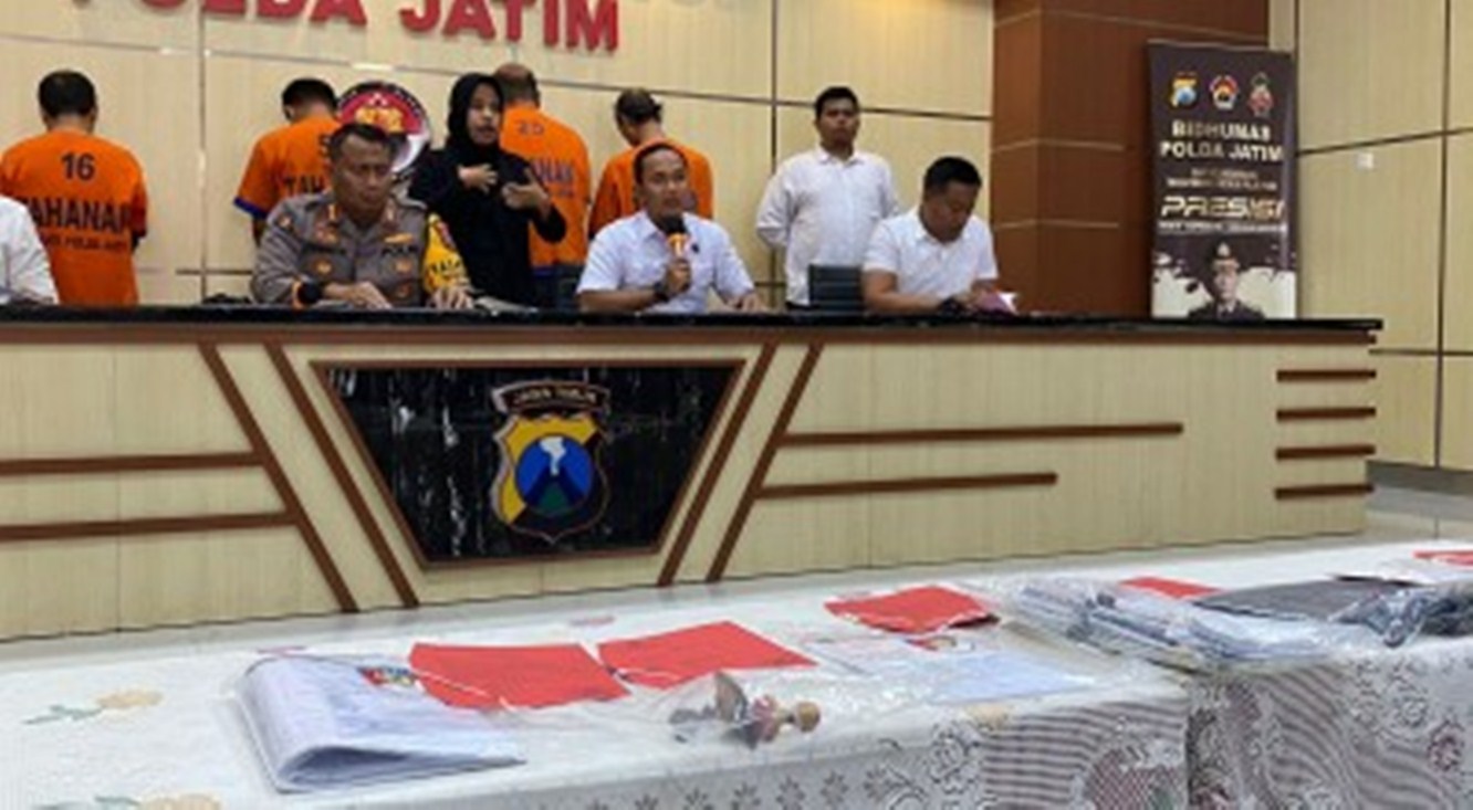 5e94249f-8634-49a1-85b6-fc3a0d7090c9 Direktorat Reserse Kriminal Umum (Ditreskrimum) Polda Jawa Timur, berhasil membongkar kasus mafia tanah, dalam konferensi pers di Mapolda Jatim, Senin (6/11/2023)