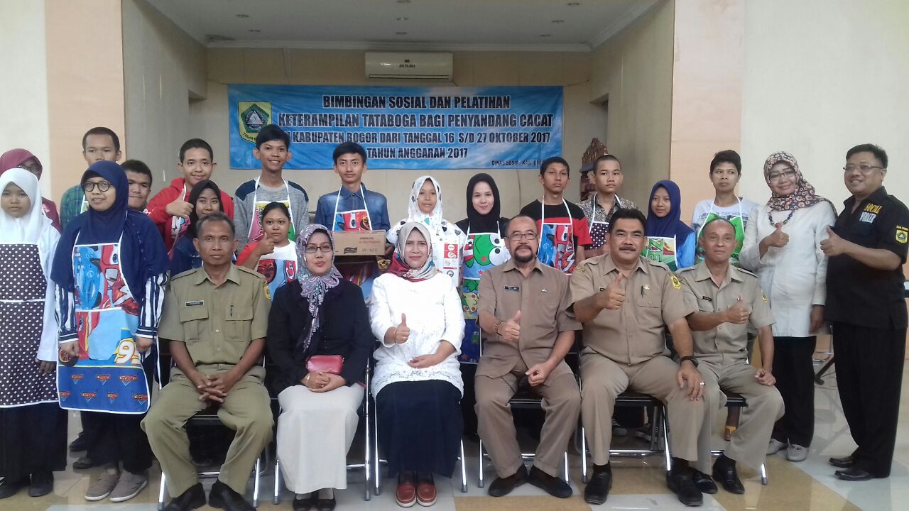 IMG-20171016-WA0134.jpg Foto bersama Kepala Dinas Sosial Roy Khaerudin, dengan penyandang disabilitas, dalam kegiatan bimbingan sosial dan pelatihan keterampilan tata boga, Senin 16/10(dok. KM) KupasMerdeka.com Berita Bogor