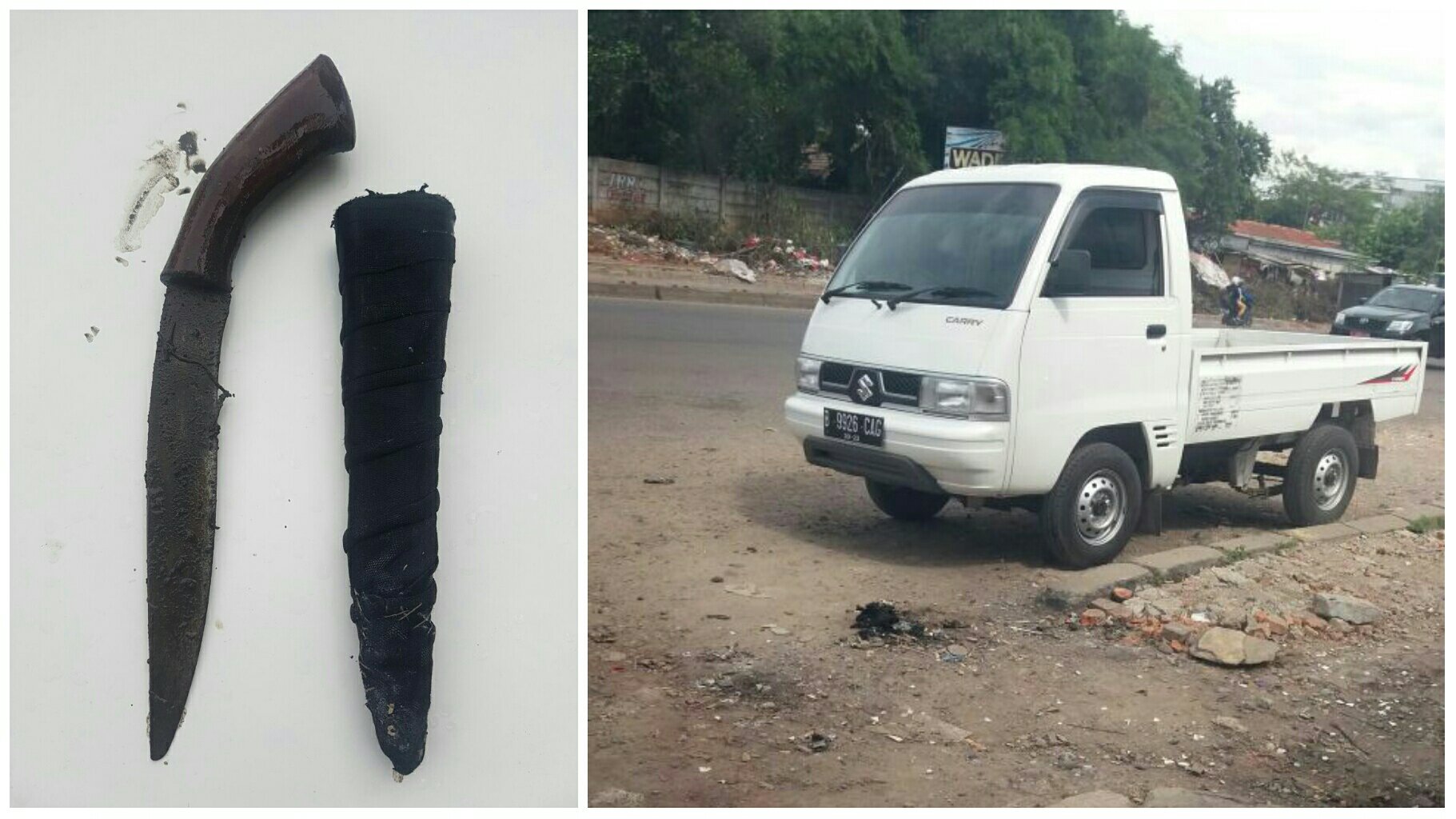 photogrid_15118572835851022486761.jpg (Kiri) Senjata tajam yang digunakan perampok mobil dan (kanan) barang bukti mobil pick up yang dirampas oleh perampok (dok. KM) KupasMerdeka.com Berita Tangerang