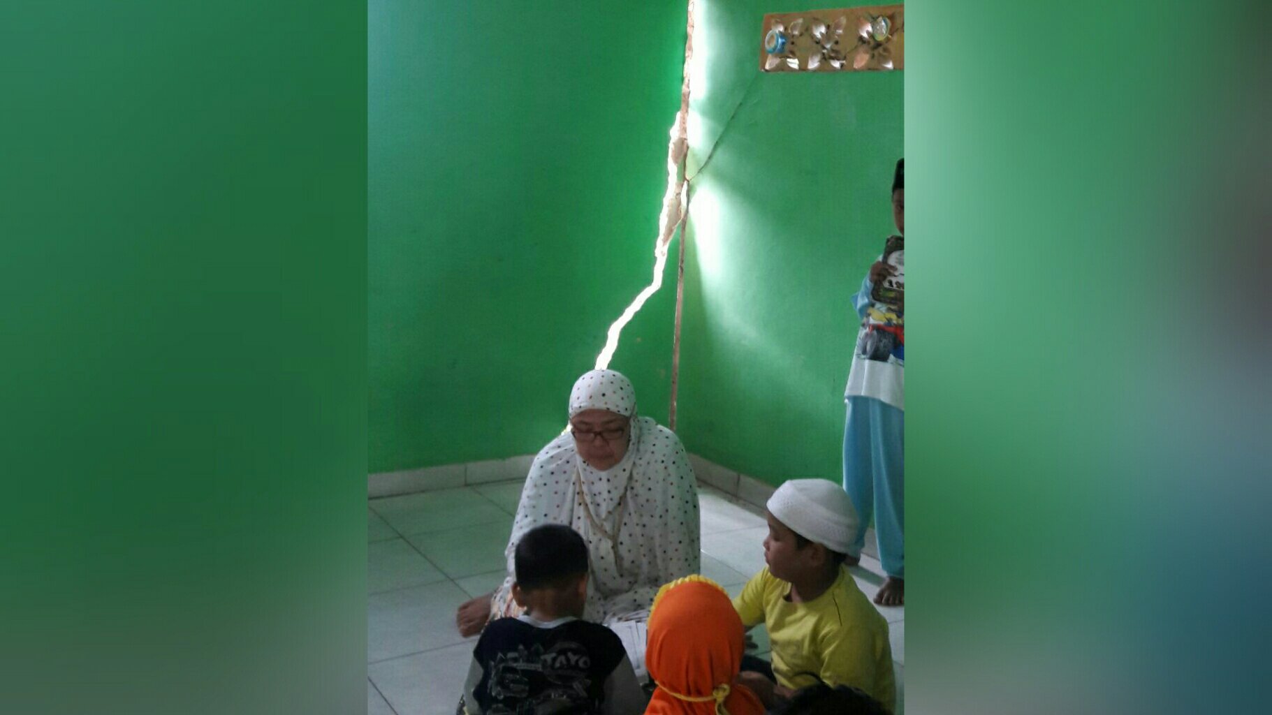 Bangunan Mushala Al - Barokah di Kampung Susukan, Desa Gunung Picung, Kecamatan Pamijahan, yang retak akibat gempa bumi yang terjadi pada Selasa 23 Januari 2018. Banguan Mushala masih digunakan untuk pengajian anak-anak walaupun membahayakan (dok. KM)