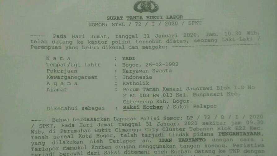 wp-1581088567541303679277.jpg Kutipan laporan kepolisian terhadap Ifan Haryanto (IH) di Polresta Bogor Kota dalam kasus dugaan penganiayaan (dok. KM) Kupasmerdeka.com Berita Bogor