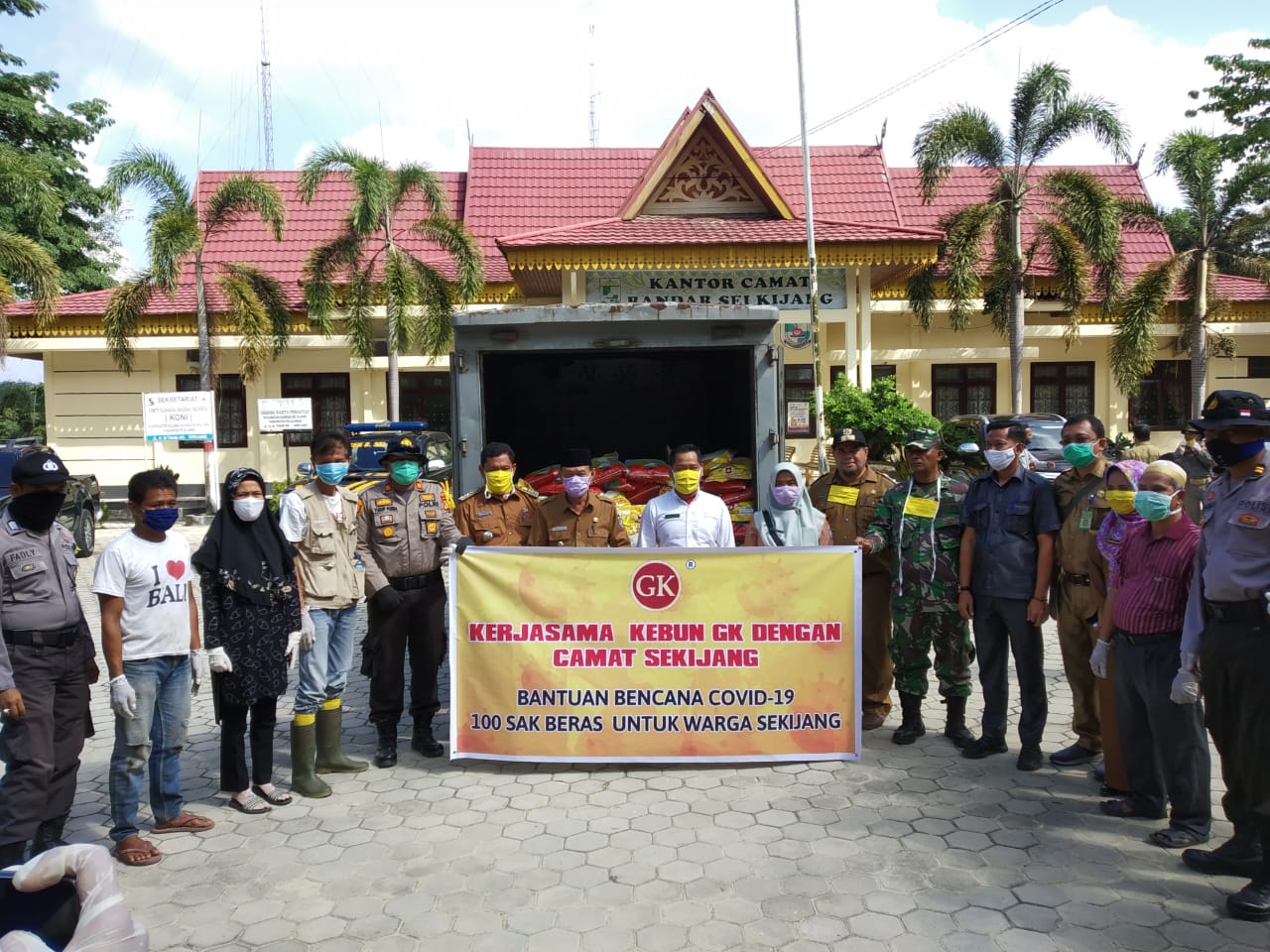Wakil Bupati Pelalawan Zardewan dan Ketua DPRD Pelalawan Adi Sukemi didampingi Camat Bandar Seikijang serta Kapolsek Bandar Seikijang AKP Yusup Purba saat pembagian bansos sembako kepada warga kurang mampu di Bandar Seikijang (dok. KM)