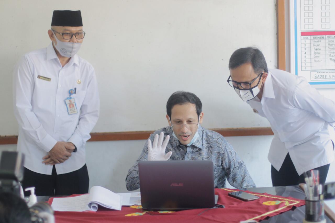wp-1596125606096.jpg Menteri Pendidikan Dan Kebudayan (Mendikbud) RI Nadiem Makarim didampingi Wali Kota Bogor saat memantau sekolah, Kamis 30/7/2020 (dok. KM) Kupasmerdeka.com Berita Bogor